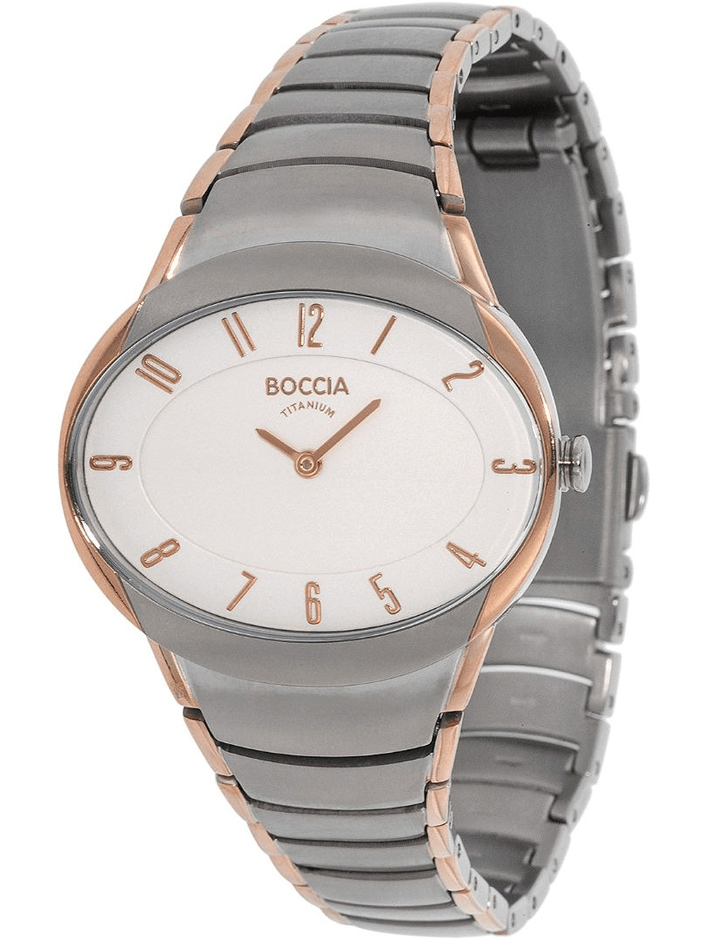 Marke: Boccia • Hersteller-Nr.: 3165-12 • Hersteller Serie: Damenuhr Titanium 36mm • Funktionen: Minute, Stunde • Antrieb: Batterie (Quarz) • Zifferblatt Farbe: Weiß • Anzeige: Analog • Wasserdichte: 5 ATM • Lünette: Feststehend • Oberfläche: Mattiert, Poliert • Gehäuse Farbe: Roségold, Silber • Gehäuse Material: Titanium • Gehäusedicke: 9 mm • Gehäuse Form: Oval • Gehäusebreite: 36 mm • Gehäuseboden: gepresst, Titaniumboden • Geschlecht: Damen • Glas: gehärtet, Mineralglas • Stil: Modern • Armband Material: Titanium • Armband Farbe: Roségold, Silber • Bandanstoßbreite: 17 mm • Schließe: Faltschließe • Max. Handgelenkumfang: 185 mm • Artikelgewicht: 0.05 kg • Lieferumfang: Anleitung, Box, Garantie Dok., Umkarton