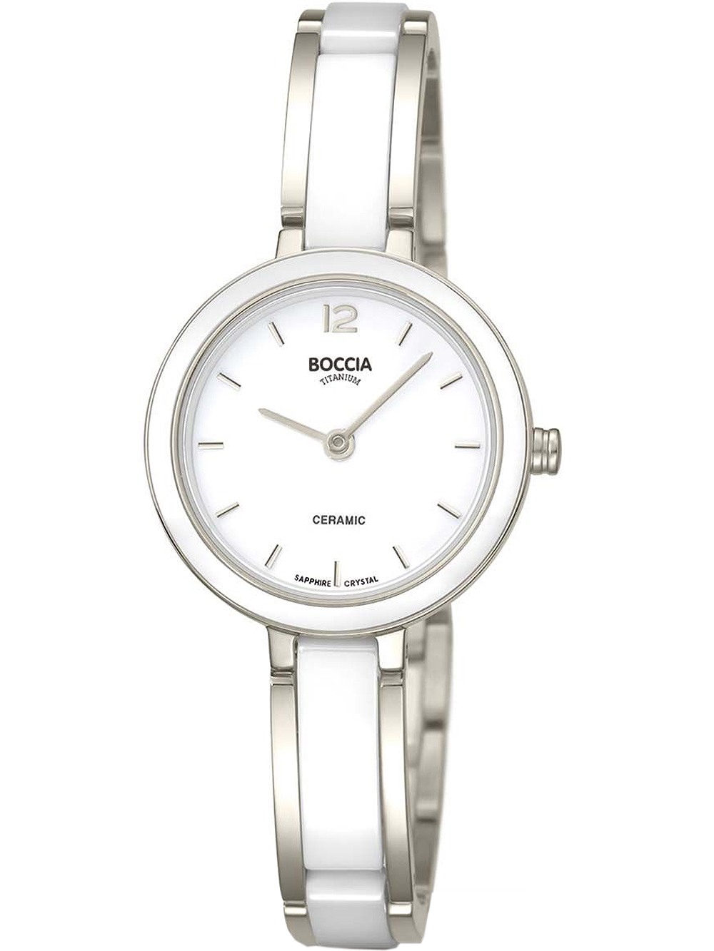 Marke: Boccia • Hersteller-Nr.: 3333-01 • Hersteller Serie: Damenuhr Ceramic Titanium 29mm • Funktionen: Minute, Stunde • Antrieb: Batterie (Quarz) • Zifferblatt Farbe: Weiß • Anzeige: Analog • Wasserdichte: 5 ATM • Lünette: Feststehend • Oberfläche: Mattiert, Poliert • Gehäuse Farbe: Silber • Gehäuse Material: Titanium • Gehäusedicke: 7 mm • Gehäuse Form: Rund • Gehäusebreite: 29 mm • Gehäuseboden: gepresst, Titaniumboden • Geschlecht: Damen • Glas: entspiegelt, Saphirglas • Stil: Modern • Armband Material: Keramik, Titanium • Armband Farbe: Silber, Weiß • Bandanstoßbreite: 10 mm • Schließe: Faltschließe • Max. Handgelenkumfang: 180 mm • Artikelgewicht: 0.04 kg • Lieferumfang: Anleitung, Box, Garantie Dok., Umkarton