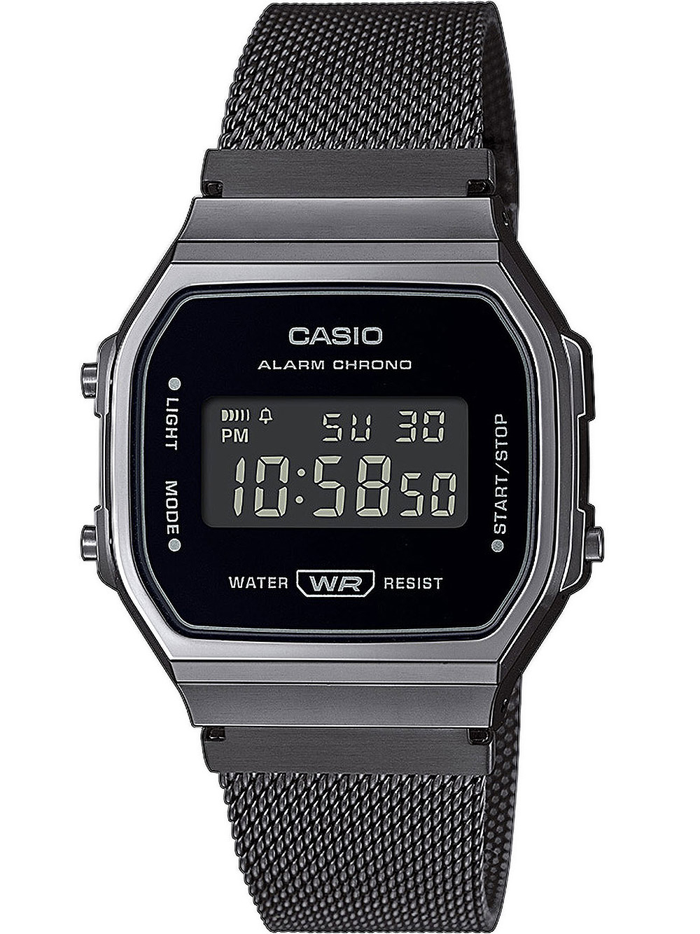 Marke: CASIO • Hersteller-Nr.: A168WEMB-1BEF • Hersteller Serie: Vintage 35mm • Funktionen: 12-24 h, Alarm, Automatischer Kalender, Datum, Minute, Sekunde, Stoppfunktion, Stunde, Wochentag • Antrieb: Batterie (Quarz) • Zifferblatt Farbe: Schwarz • Anzeige: Digital • Wasserdichte: 11798 ATM • Lünette: Feststehend • Oberfläche: Poliert • Gehäuse Farbe: Grau • Gehäuse Material: Resin • Gehäusedicke: 10 mm • Gehäuse Form: Rechteck • Gehäusebreite: 35 mm • Gehäuseboden: Edelstahlboden, verschraubt • Geschlecht: Damen, Herren, Unisex • Glas: Acrylglas • Beleuchtung: Illuminator • Stil: Modern • Armband Material: Edelstahl • Armband Farbe: Grau • Bandanstoßbreite: 19 mm • Schließe: Klippschließe • Max. Handgelenkumfang: 220 mm • Artikelgewicht: 0.06 kg • Lieferumfang: Anleitung, Box, Garantie Dok., Umkarton