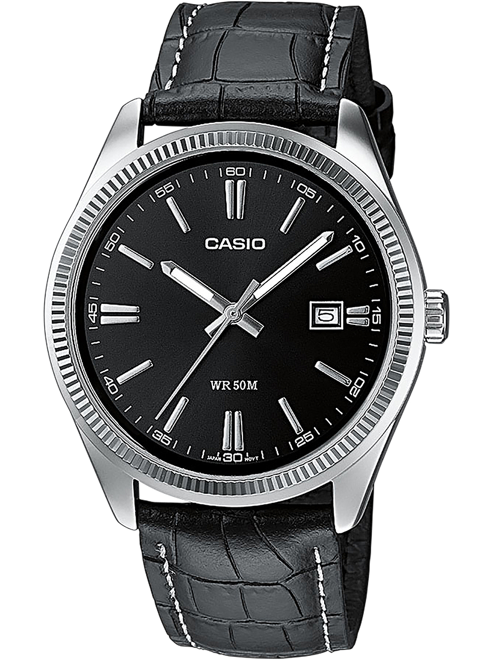 Marke: CASIO • Hersteller-Nr.: MTP-1302PL-1AVEF • Hersteller Serie: Collection 39mm • Funktionen: Datum, Minute, Sekunde, Stunde • Antrieb: Batterie (Quarz) • Zifferblatt Farbe: Schwarz • Anzeige: Analog • Wasserdichte: 5 ATM • Lünette: Feststehend • Oberfläche: Mattiert, Poliert • Gehäuse Farbe: Silber • Gehäuse Material: Edelstahl • Gehäusedicke: 10 mm • Gehäuse Form: Rund • Gehäusebreite: 39 mm • Gehäuseboden: Edelstahlboden, gepresst • Geschlecht: Herren • Glas: gehärtet, Mineralglas • Beleuchtung: Leuchtzeiger • Stil: Modern • Armband Material: Kalbsleder • Armband Farbe: Schwarz • Bandanstoßbreite: 20 mm • Schließe: Dornschließe • Max. Handgelenkumfang: 215 mm • Artikelgewicht: 0.05 kg • Lieferumfang: Anleitung, Box, Garantie Dok., Umkarton