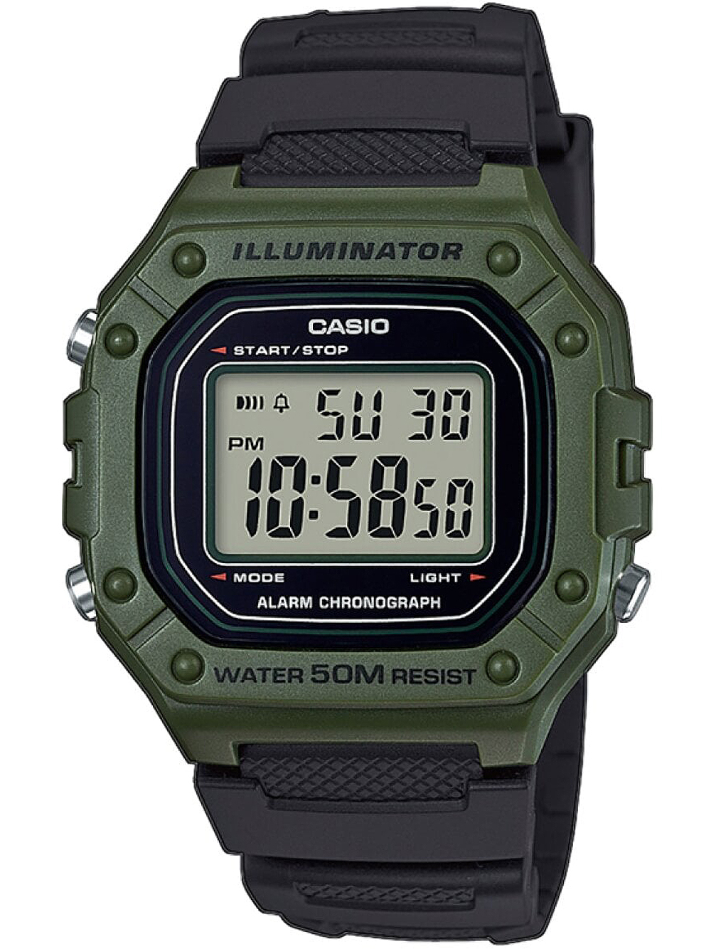 Marke: CASIO • Hersteller-Nr.: W-218H-3AVEF • Hersteller Serie: Collection 43mm • Funktionen: 12-24 h, Alarm, Automatischer Kalender, Datum, Minute, Sekunde, Stoppfunktion, Stunde, Wochentag • Antrieb: Batterie (Quarz) • Zifferblatt Farbe: Grau • Anzeige: Digital • Wasserdichte: 5 ATM • Lünette: Feststehend • Oberfläche: Mattiert • Gehäuse Farbe: Grün • Gehäuse Material: Resin • Gehäusedicke: 11 mm • Gehäuse Form: Rechteck • Gehäusebreite: 43 mm • Gehäuseboden: Edelstahlboden, verschraubt • Geschlecht: Herren • Glas: Acrylglas • Beleuchtung: LED Light • Stil: Sportlich • Armband Material: Resin • Armband Farbe: Schwarz • Bandanstoßbreite: 25 mm • Schließe: Dornschließe • Max. Handgelenkumfang: 225 mm • Artikelgewicht: 0.04 kg • Lieferumfang: Anleitung, Box, Garantie Dok., Umkarton