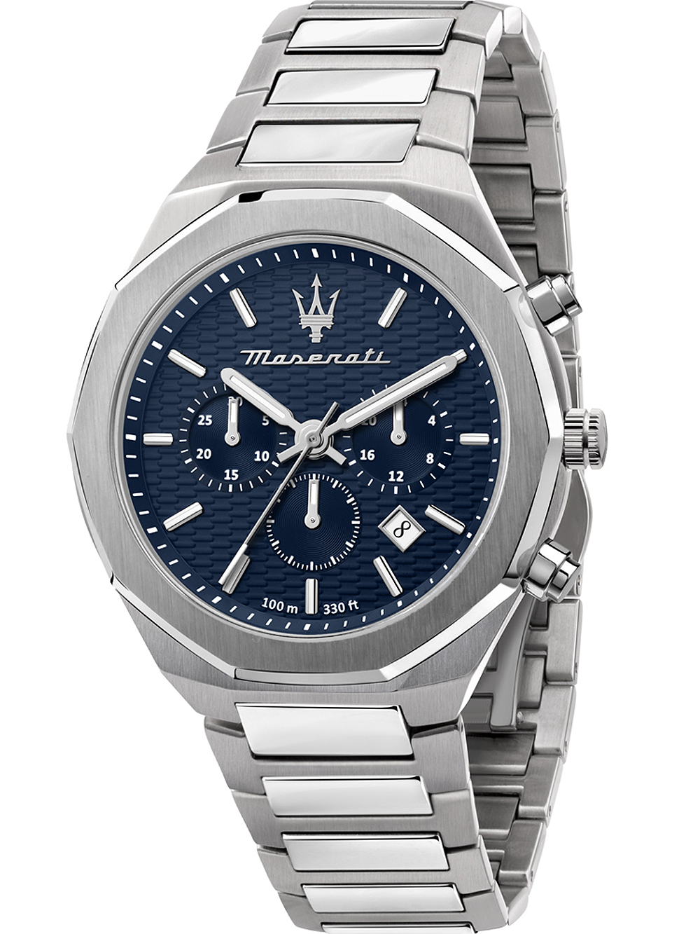 Marke: MASERATI • Hersteller-Nr.: R8873642006 • Hersteller Serie: Stile Chrono 45mm • Funktionen: 24-Stunden, Chronograph, Datum, Minute, Sekunde, Stunde • Antrieb: Batterie (Quarz) • Zifferblatt Farbe: Blau • Anzeige: Analog • Wasserdichte: 10 ATM • Lünette: Feststehend • Oberfläche: Mattiert, Poliert • Gehäuse Farbe: Silber • Gehäuse Material: Edelstahl • Gehäusedicke: 12 mm • Gehäuse Form: Rund • Gehäusebreite: 45 mm • Gehäuseboden: Edelstahlboden, verschraubt • Geschlecht: Herren • Krone: Verschraubt • Glas: gehärtet, Mineralglas • Beleuchtung: Leuchtindexe, Leuchtzeiger • Stil: Modern • Armband Material: Edelstahl • Armband Farbe: Silber • Bandanstoßbreite: 23 mm • Schließe: Schmetterlingsschließe • Max. Handgelenkumfang: 210 mm • Artikelgewicht: 0.17 kg • Lieferumfang: Anleitung, Box, Garantie Dok., Umkarton