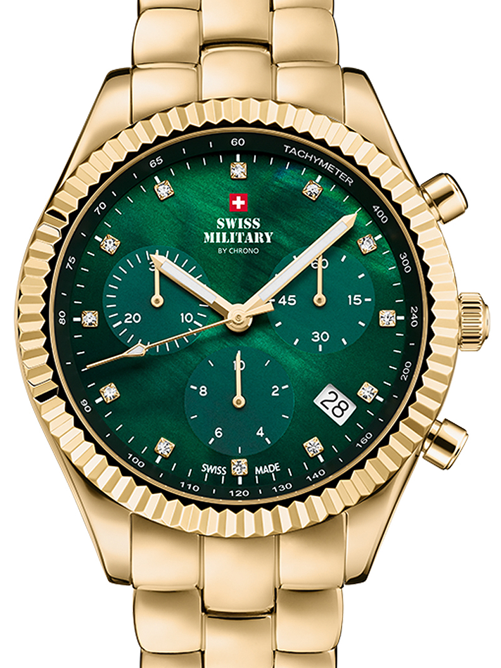 Marke: Swiss Military by Chrono • Hersteller-Nr.: SM30207.04 • Hersteller Serie: Elegant Chronograph 38 mm • Funktionen: Chronograph, Datum, Minute, Sekunde, Stunde • Antrieb: Batterie (Quarz) • Uhrwerk Bezeichnung: 5040.D, Ronda • Zifferblatt Farbe: Grün, Perlmutt • Anzeige: Analog • Wasserdichte: 5 ATM • Lünette: Feststehend • Oberfläche: Mattiert, Poliert • Gehäuse Farbe: Gold • Gehäuse Material: Edelstahl • Gehäusedicke: 11 mm • Gehäuse Form: Rund • Gehäuse Besatz: Zirkonia • Gehäusebreite: 38 mm • Gehäuseboden: Edelstahlboden, verschraubt • Geschlecht: Damen • Glas: entspiegelt, Saphirglas • Beleuchtung: Leuchtzeiger • Stil: Sportlich • Armband Material: Edelstahl • Armband Farbe: Gold • Bandanstoßbreite: 18 mm • Schließe: Faltschließe • Max. Handgelenkumfang: 190 mm • Artikelgewicht: 0.12 kg • Lieferumfang: Anleitung, Box, Garantie Dok., Umkarton