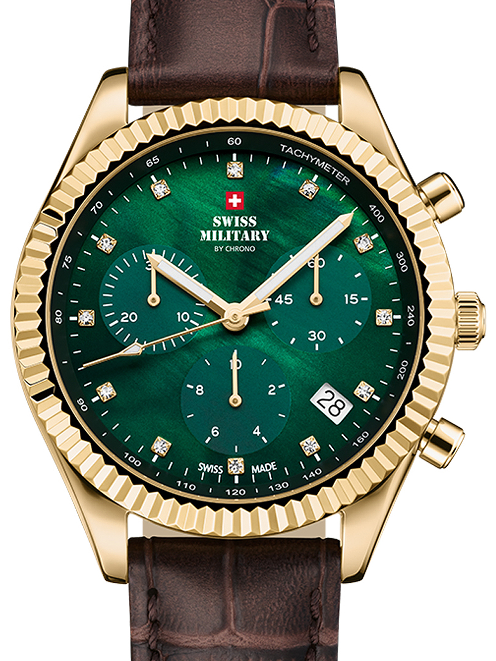 Marke: Swiss Military by Chrono • Hersteller-Nr.: SM30207.08 • Hersteller Serie: Elegant Chronograph 38 mm • Funktionen: Chronograph, Datum, Minute, Sekunde, Stunde • Antrieb: Batterie (Quarz) • Uhrwerk Bezeichnung: 5040.D, Ronda • Zifferblatt Farbe: Grün, Perlmutt • Anzeige: Analog • Wasserdichte: 5 ATM • Lünette: Feststehend • Oberfläche: Mattiert, Poliert • Gehäuse Farbe: Gold • Gehäuse Material: Edelstahl • Gehäusedicke: 11 mm • Gehäuse Form: Rund • Gehäuse Besatz: Zirkonia • Gehäusebreite: 38 mm • Gehäuseboden: Edelstahlboden, verschraubt • Geschlecht: Damen • Glas: entspiegelt, Saphirglas • Beleuchtung: Leuchtzeiger • Stil: Sportlich • Armband Material: Kalbsleder • Armband Farbe: Braun • Bandanstoßbreite: 18 mm • Schließe: Dornschließe • Max. Handgelenkumfang: 215 mm • Artikelgewicht: 0.06 kg • Lieferumfang: Anleitung, Box, Garantie Dok., Umkarton