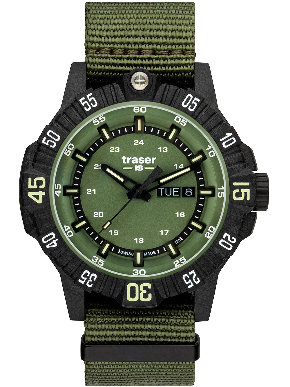 Marke: Traser • Hersteller-Nr.: 110726 • Hersteller Serie: P99 Q Tactical Green 46mm • Funktionen: Datum, Minute, Sekunde, Stunde, Wochentag • Antrieb: Batterie (Quarz) • Uhrwerk Bezeichnung: Swiss Made • Zifferblatt Farbe: Grün • Anzeige: Analog • Wasserdichte: 20 ATM • Lünette: beidseitig, Drehbar • Oberfläche: Mattiert • Gehäuse Farbe: Schwarz • Gehäuse Material: Edelstahl • Gehäusedicke: 10 mm • Gehäuse Form: Rund • Gehäusebreite: 46 mm • Gehäuseboden: Edelstahlboden, verschraubt • Geschlecht: Herren • Krone: Verschraubt • Glas: entspiegelt, Saphirglas • Beleuchtung: trigalight® • Stil: Sportlich • Armband Material: Textil • Armband Farbe: Grün • Bandanstoßbreite: 22 mm • Schließe: Dornschließe • Max. Handgelenkumfang: 240 mm • Artikelgewicht: 0.09 kg • Lieferumfang: Anleitung, Box, Garantie Dok., Umkarton